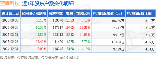 从股价来看,2025年6月30日至2025年9月30日,蓝思科技区间涨幅为50.13%,在此期间股东户数增加1.21万户,增幅为8.15%。