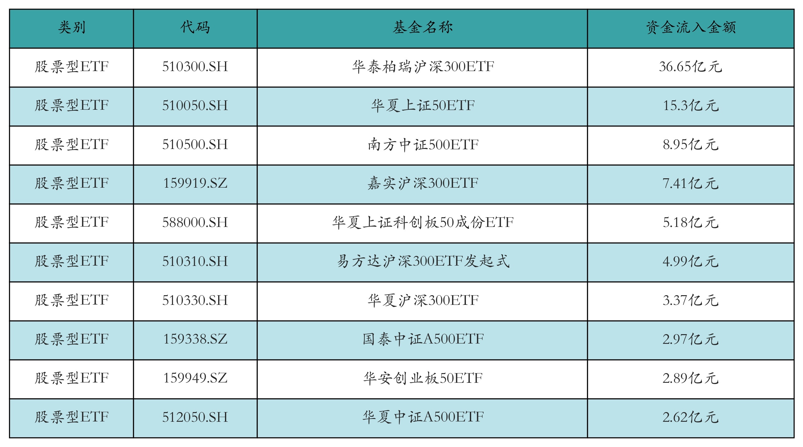 昨日股票型ETF资金流入最多的3只ETF及其流入金额分别为:华泰柏瑞沪深300ETF(流入36.65亿元)、华夏上证50ETF(流入15.3亿元)、南方中证500ETF(流入8.95亿元)。资金流入前10详情见下表: