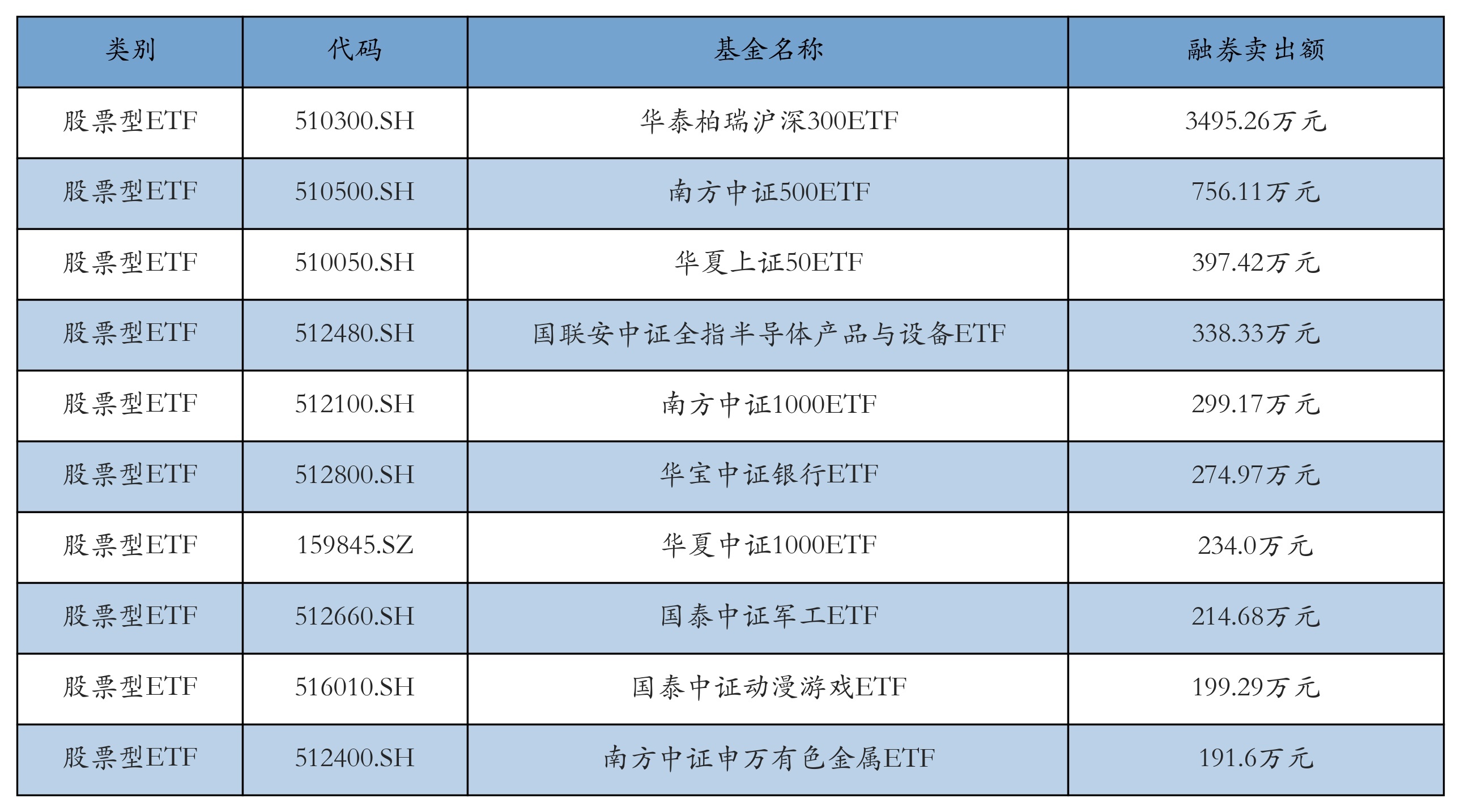 昨日股票型ETF融资卖出额最高的3只ETF及其卖出金额分别为:华泰柏瑞沪深300ETF(3495.26万元)、南方中证500ETF(756.11万元)、华夏上证50ETF(397.42万元)。融券卖出额前10详情见下表: