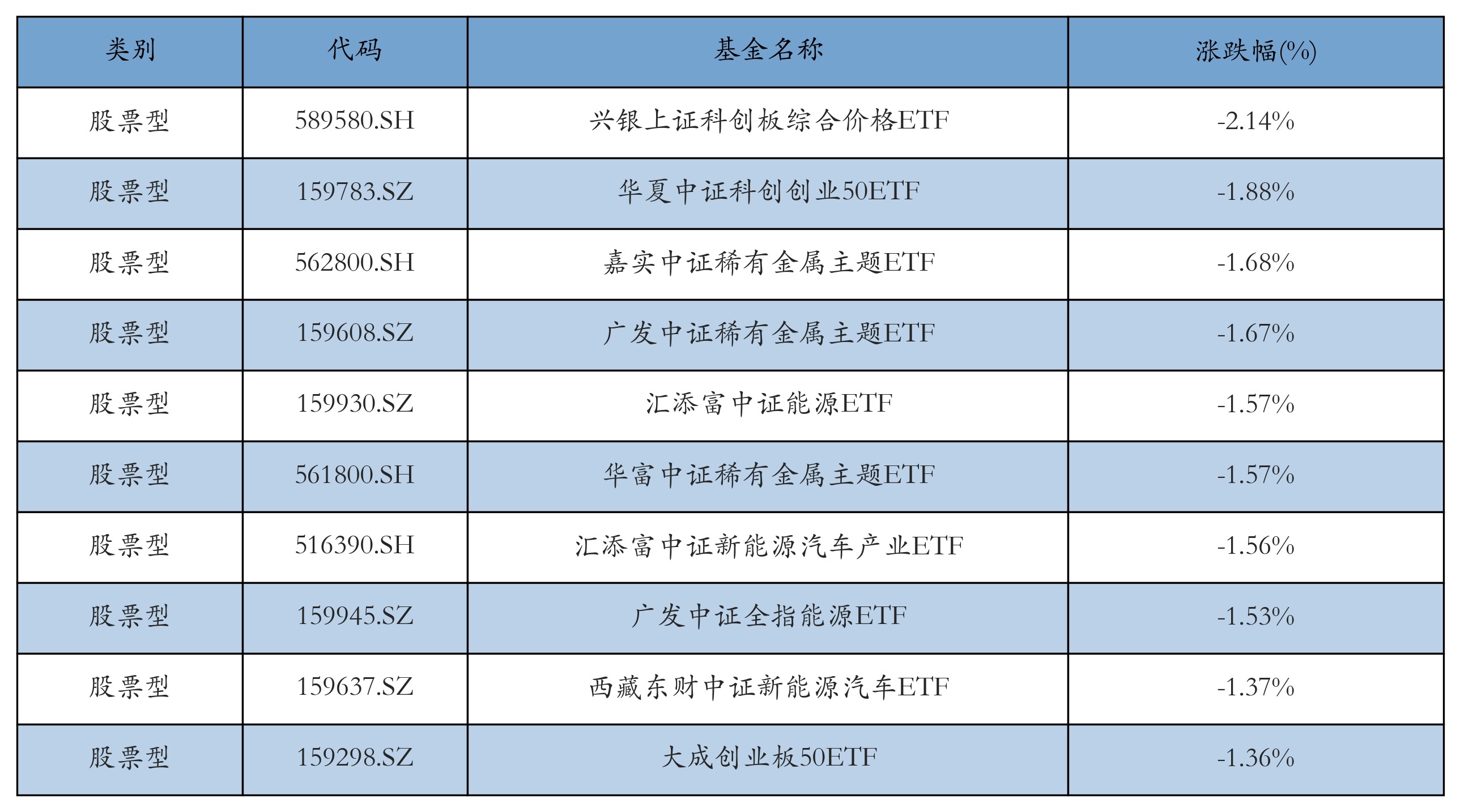 昨日股票型ETF跌幅最大的3只ETF及其收益率分别为:兴银上证科创板综合价格ETF(-2.14%)、华夏中证科创创业50ETF(-1.88%)、嘉实中证稀有金属主题ETF(-1.68%)。跌幅前10详情见下表: