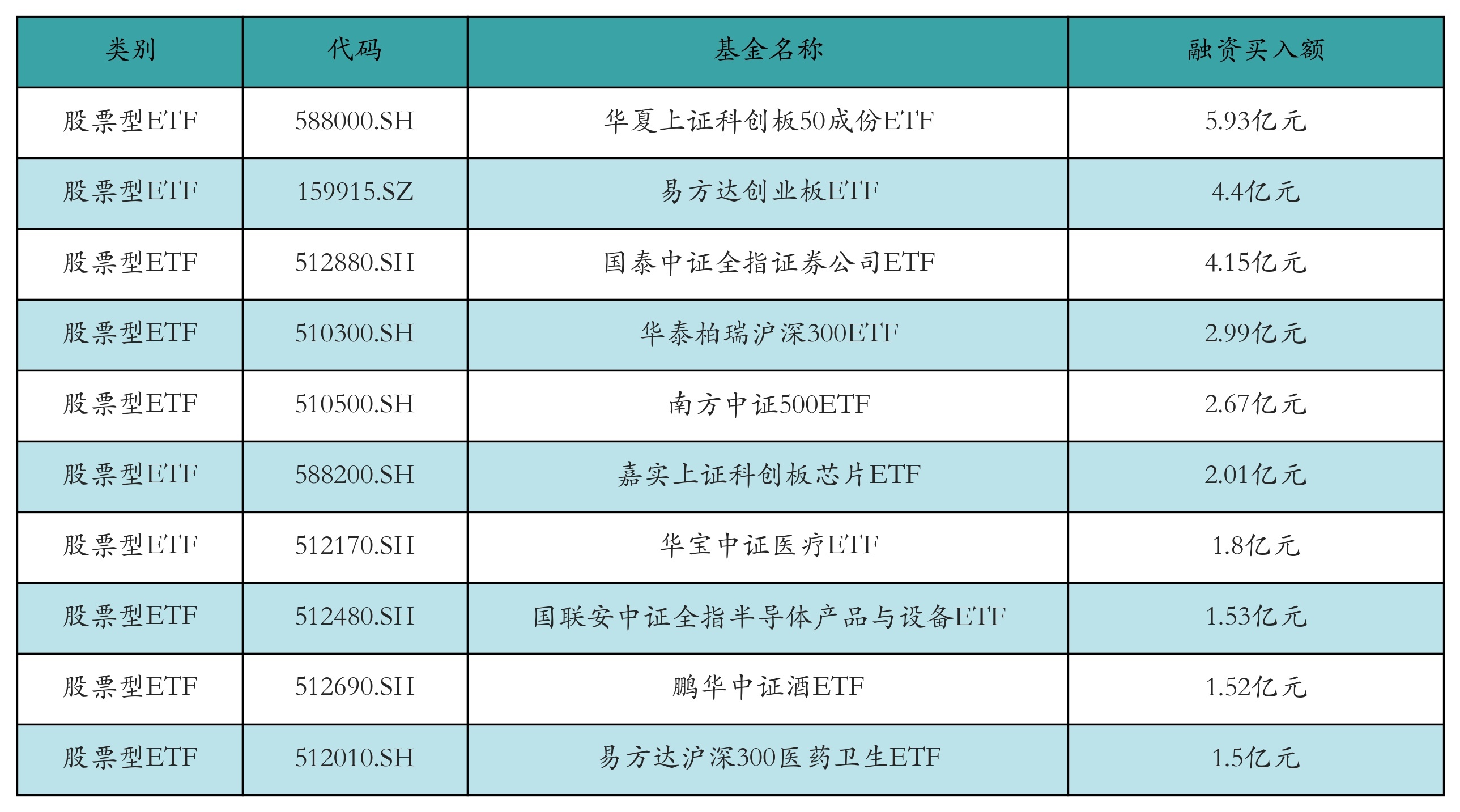 昨日股票型ETF融资买入额最高的3只ETF及其买入金额分别为:华夏上证科创板50成份ETF(5.93亿元)、易方达创业板ETF(4.4亿元)、国泰中证全指证券公司ETF(4.15亿元)。融资买入额前10详情见下表: